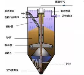 1. 活性砂濾池 1.1 工藝概況 活性砂過濾器是一種集絮凝、澄清、過濾為一體的連續(xù)過濾設(shè)備,廣泛應(yīng)用于飲用水、工業(yè)用水、污水深度處理及中水回用處理領(lǐng)域。系統(tǒng)采用升流式流動床過濾原理和單一均質(zhì)濾料,過濾與洗砂同時進行,能夠24小時連續(xù)自動運行,巧妙的提砂和洗砂結(jié)構(gòu)代替了傳統(tǒng)大功率反沖洗系統(tǒng),能耗極低,其工作原理如圖所示。